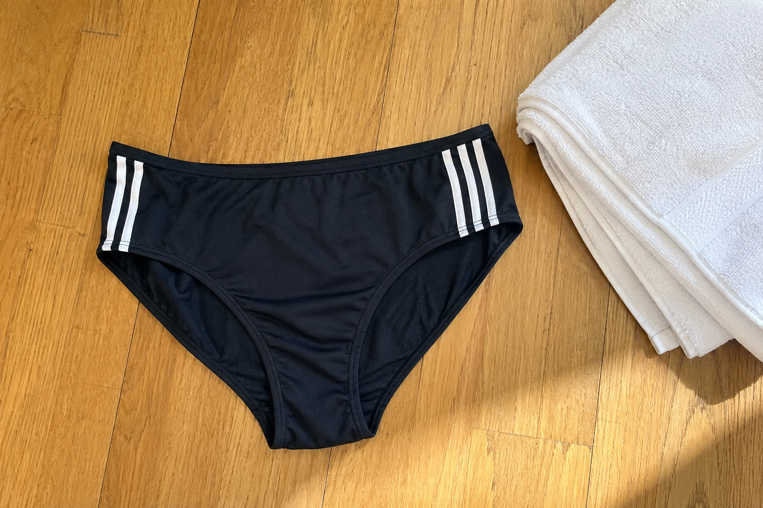 Black sport brief, three white stripes — pilates 90